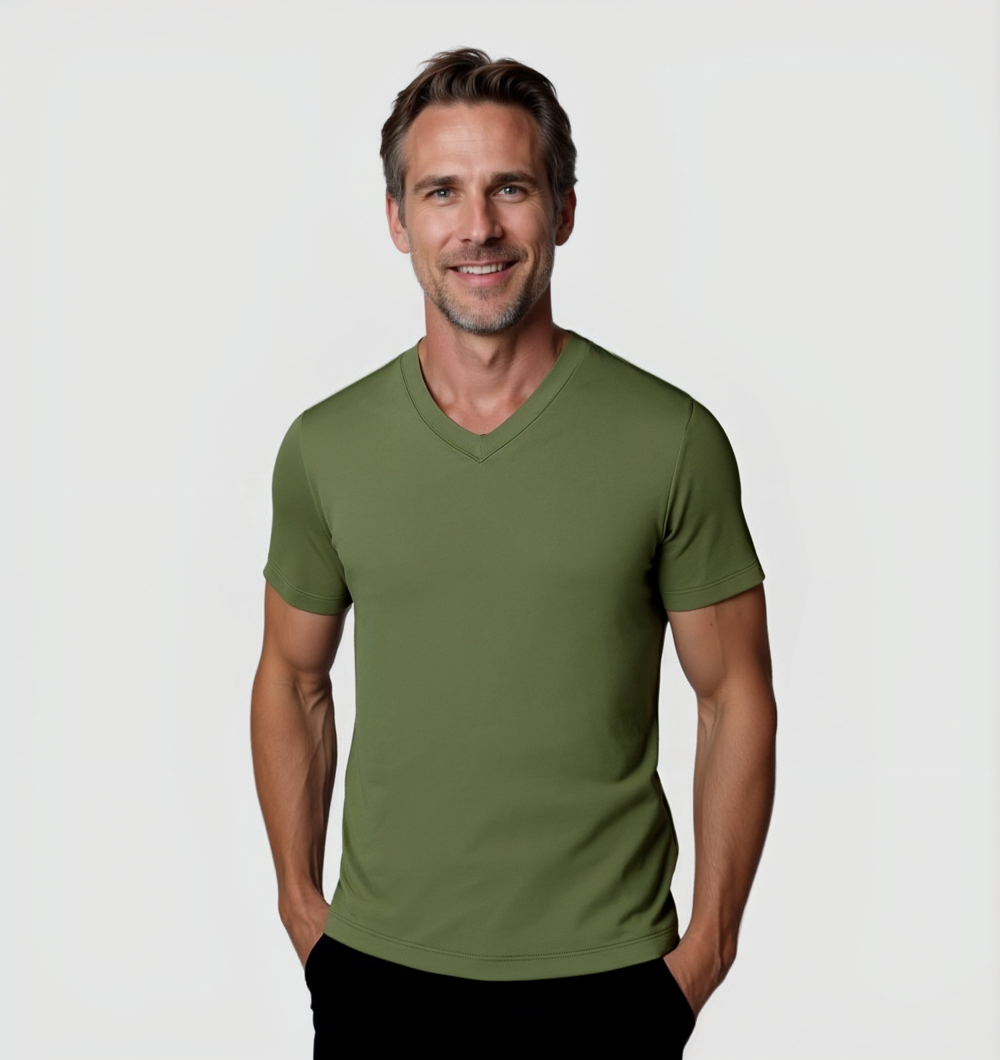 Ce t-shirt est confectionné à partir d'un mélange de coton peigné filé à l'anneau (72%) et de Sorona (28%), offrant une qualité et une douceur inégalées. De plus, le tissu ne rétrécira que de manière minimale (5%) en utilisant un réglage de chaleur douce dans le sèche-linge.